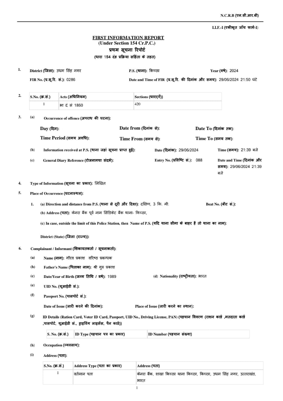 किच्छा: बैंक लोन के 15 लाख हड़पने का आरोप, एफआईआर दर्ज।