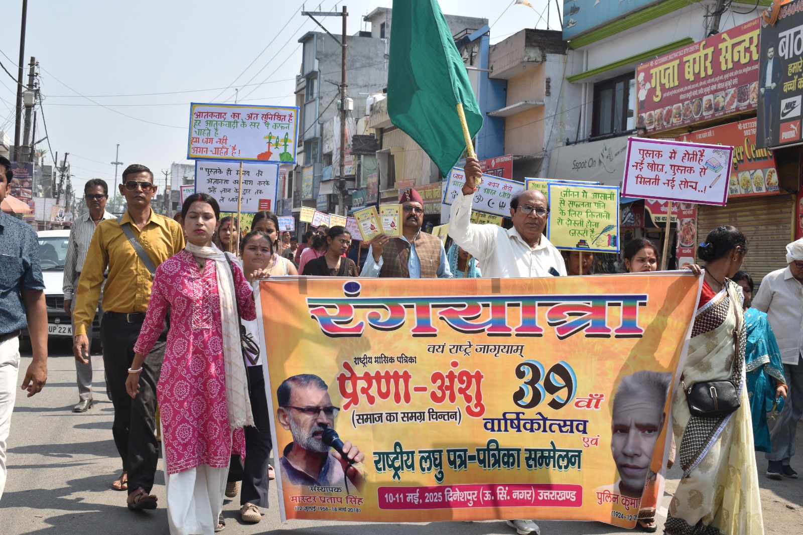 दिनेशपुर। उत्तराखंड से पिछले 39 सालों से निरंतर प्रकाशित हो रहे राष्ट्र और समाज के समग्र चिंतन की मासिक वैचारिक व साहित्यिक पत्रिका प्रेरणा-अंशु के 39वें वार्षिकोत्सव के अवसर पर प्रेरणा-अंशु, अनसुनी आवाज और समाजोत्थान परिवार की ओर से 10, 11 मई को दिनेशपुर स्थित ऑडोटोरियम में राष्ट्रीय लघु पत्र-पत्रिका सम्मेलन का शुभारम्भ भव्य ढंग से बड़ी संख्या में स्कूली बच्चों, छात्र-छात्राओं, शिक्षकों, प्रध्यापकों, साहित्यकारों, संपादकों, रंगकर्मियों और आम नागरिकों की उपस्थिति में सम्पन्न हुआ। इस अवसर पर वरिष्ठ साहित्यकार हेतु भारद्वाज ने रंग यात्रा की शुरूआत हरी झंडी दिखा कर किया। रंगयात्रा में पढ़ने-लिखने की संस्कृति बहाल करने, नशा खत्म करने, समाज में अमन-चैन कायम रखने, पर्यावरण को बचाने के पोस्टरों के साथ सभी लोगों ने दिनेशपुर में स्वामी विवेकानंद, पुलिनबाबू और नेता जी सुभाष चंद्र बोस की प्रतिमा पर माल्यार्पण करके पूरे नगर की परिक्रमा की।