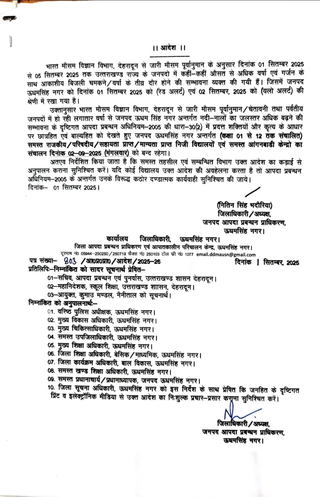 उक्तानुसार भारत मौसम विज्ञान विभाग, देहरादून से जारी मौसम पूर्वानुमान / चेतावनी तथा पर्वतीय जनपदों में हो रही लगातार वर्षा से जनपद ऊधम सिंह नगर अन्तर्गत नदी-नालों का जलस्तर अधिक बढ़ने की सम्भावना के दृष्टिगत आपदा प्रबन्धन अधिनियम-2005 की धारा-30 (2) में प्रदत्त शक्तियों और कृत्य के आधार पर छात्रहित एवं बाल्यहित को देखते हुए जनपद ऊधमसिंह नगर अन्तर्गत (कक्षा 01 से 12 तक संचालित) समस्त राजकीय/परिषदीय/सहायता प्राप्त / मान्यता प्राप्त निजी विद्यालयों एवं समस्त आंगनबाडी केन्द्रो का संचालन दिनांक 02-09-2025 (मंगलवार) को बन्द रहेगा।